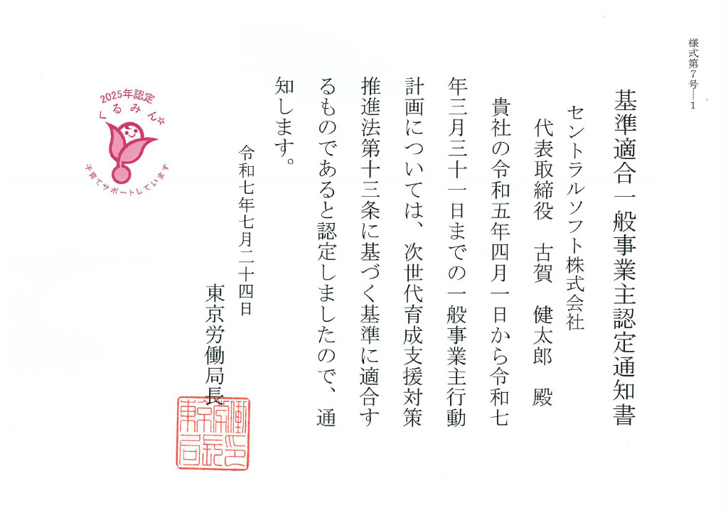 当社は、次世代育成支援対策推進法に基づき、一般事業主行動計画を策定した企業のうち、計画に定めた目標を達成し同法の基準を満たした「子育てサポート企業」として、2025年7月24日付けで厚生労働大臣の認定(くるみん認定)を受けました。