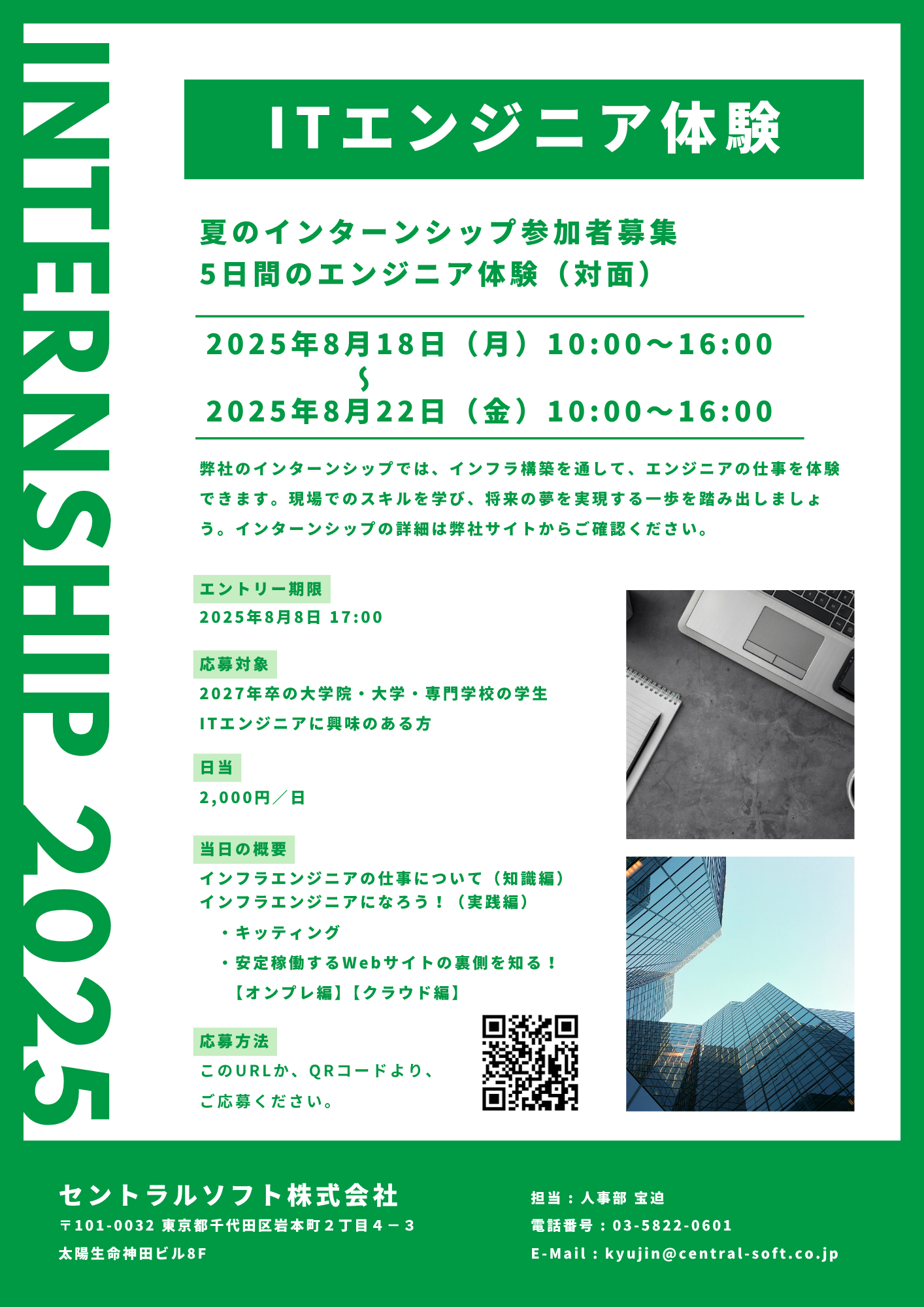 「ITインフラエンジニア用の5Days インターンシップ」のエントリーは↑の緑のBOXをクリックし、リンク先のフォームより受付いたします。